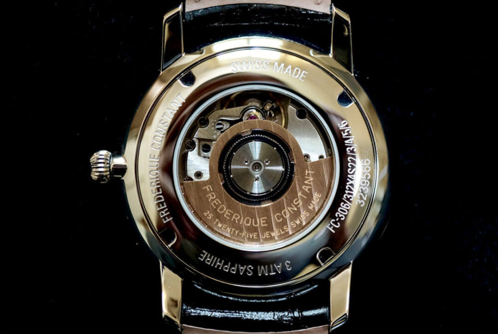 Toute cette mécanique prend vie grâce au calibre FC-306, 25 rubis, issue de la manufacture Frédérique Constant.
