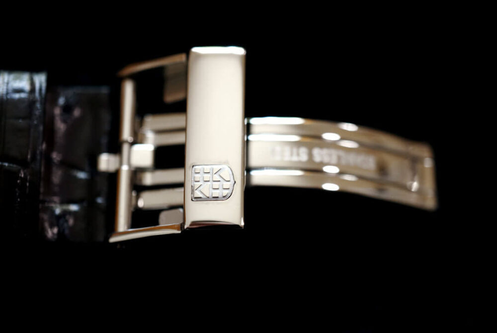 Nous découvrons une montre d’un diamètre de 40mm pour une épaisseur de seulement 8mm. Des dimensions plutôt compactes, renforcées par un fond de boîte convexe qui affine encore le profil de cette « Slimline ».