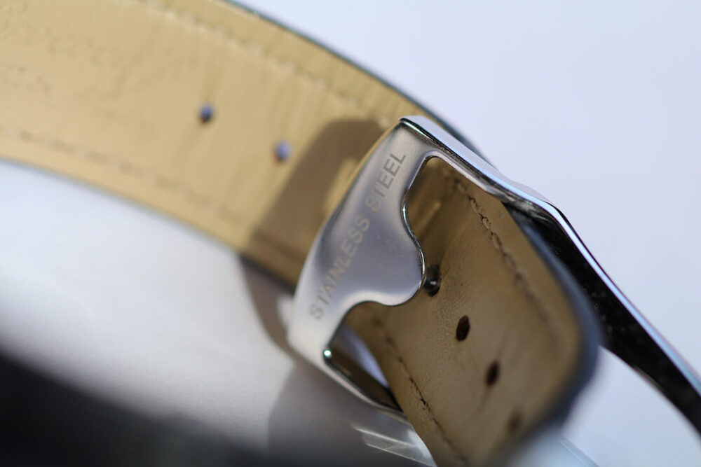 On commence par un beau bracelet en crocodile « fait main » de 18 mm au niveau de la boucle déployante, qui se prolonge jusqu’à atteindre 21 mm au niveau de l’entre-corne d’un cadran chromé au design classique, sobre et atemporel.