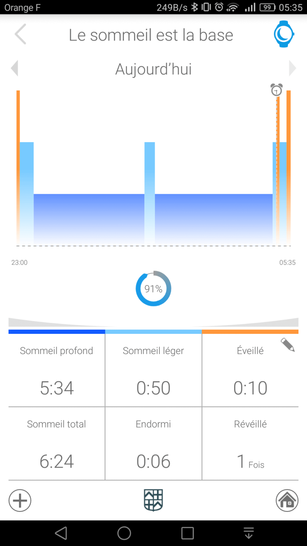 Le mode sommeil est en revanche convainquant dans la réalisation. La montre placée sous l’oreiller ou porter au bras (cette nuance est à définir via l’application) capte de façon surprenante les variations du sommeil et vous réveil bien à la fin d’un cycle (si toutefois vous l’y avez autorisé dans les réglages via une plage de réveil). Si cette option ne sera pas très utile aux personnes ayant l’habitude de se lever tous les jours à la même heure, elle est plutôt pratique lorsque le rythme est brisé.