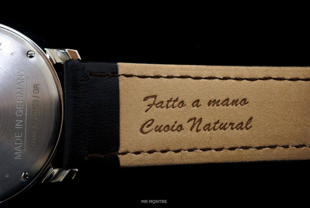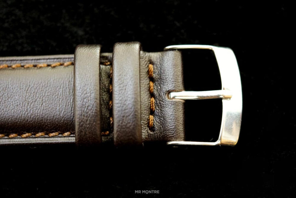 Cette Bauhaus 6046-5 est livrée avec son bracelet marron, surpiqûres ton sur ton et façonné en cuir italien. Son entrecorne est de 20 mm pour une longueur de 22 cm et il est monté sur une boucle ardillon en acier poli.