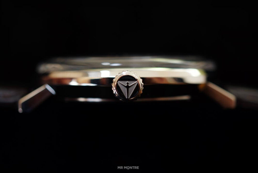 La couronne classiquement situé à 3 heures présente le logo triangulaire de la marque Junkers et permet le réglage de la date en position 1 et celle de l’heure en position 2.