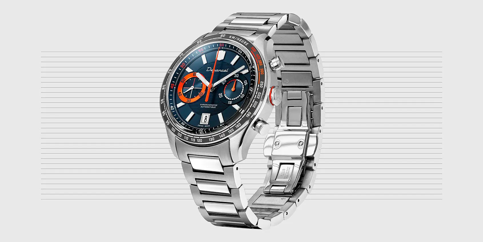 Enfin, la Depancel Tangerine s’attache au poignet à l’aide d’un bracelet en métal avec maillons H, boucle déployante double et système interchangeable. Ceux qui préfèrent pourront choisir la version avec cuir de vachette bleu pour un look plus élégant.