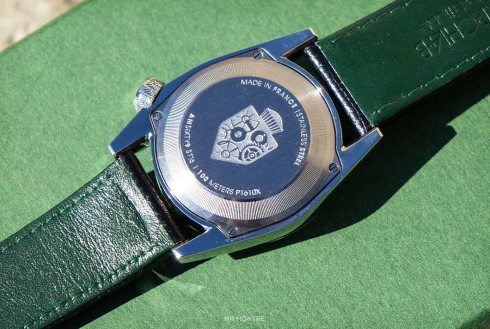 Le fond de boîte en acier est quant à lui maintenu par quatre vis. On y retrouve gravé le blason de la Maison March LAb, la référence de la montre ainsi que son étanchéité. Comptez 100 m, soit 10 ATM. Elle pourra vous accompagner à la piscine ou sous la douce, mais attention, pas de plongée avec les bouteilles.