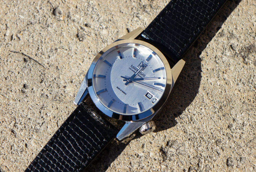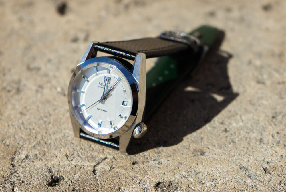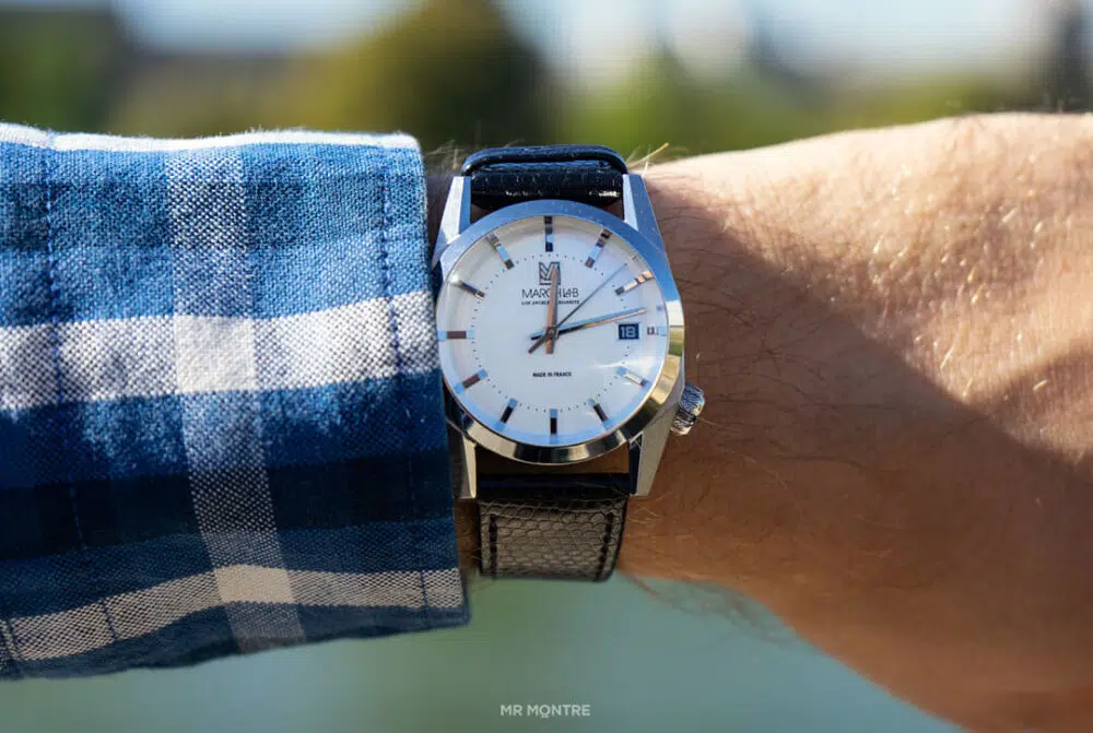 Le logo March Lab est positionné à 12h, faisant face à la mention « made in France » à 6h. L’index des 3h est réduit pour faire place au guichet de date noir et à la police blanche de la marque.