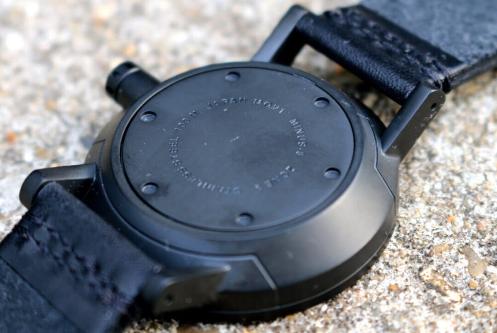 Les proportions de la Zone 2 sont assez standards. Le diamètre du boitier est de 40 mm pour 9.5 mm d’épaisseur. La boite est entièrement fabriquée en acier inoxydable 316L et bénéficie d’une finition PVD Noir mat. Pour rappel, le PVD (Physical Vapor Deposition) est un procédé industriel initialement développé par la NASA, qui permet de déposer par vaporisation un revêtement de dépôts métalliques. Contrairement aux revêtements plus bas de gamme comme l’électrolyse, le PVD est plus dur et plus résistant à la corrosion.