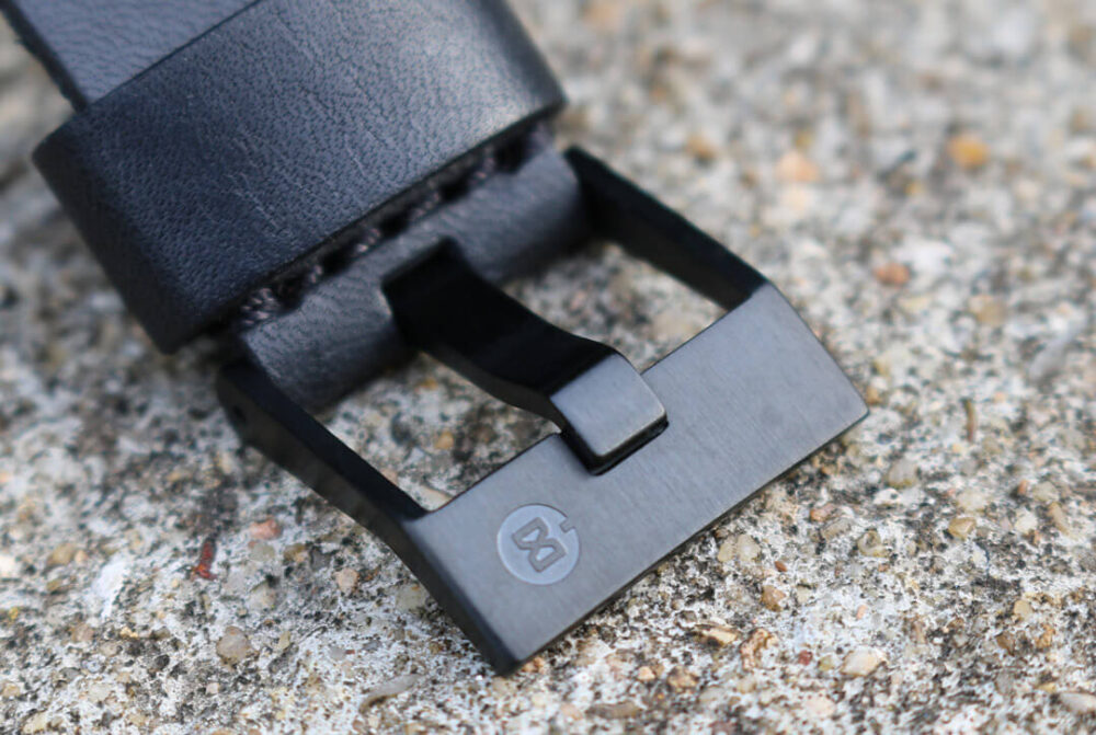 La Zone 2 est livrée avec un bracelet en cuir végétal de couleur noire. Afin d’être ajusté à la bonne taille de poignet, il vous faudra compter sur une boucle ardillon en acier PVD noir gravé du logo de la marque. Bien que visuellement réussi, nous avons un petit doute sur la qualité du bracelet qui commence à légèrement s’effilocher après quelques jours d’utilisation. Rien de bien méchant.