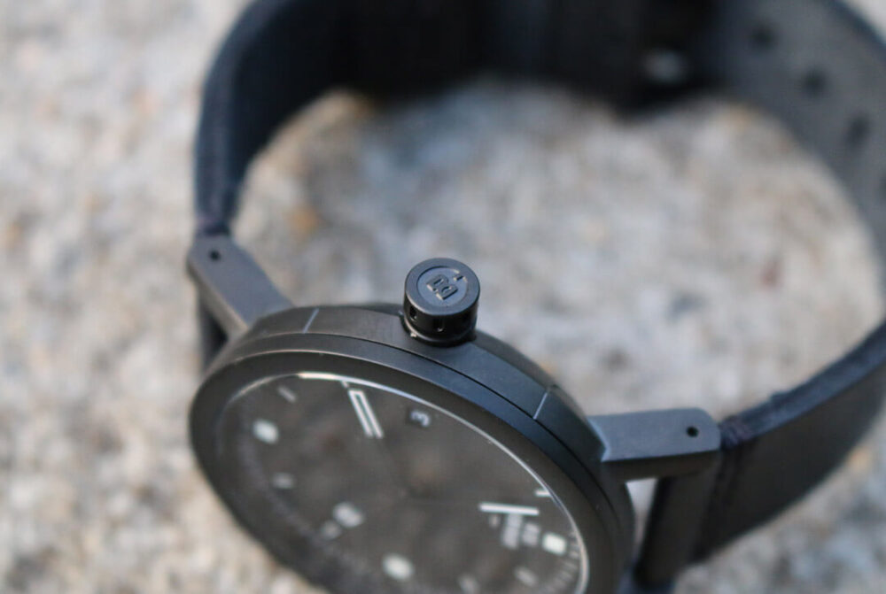 Afin d’avoir un design cohérent, le bouton poussoir situé à 3 heures est également noir. Le logo « -8 » représentant Minus-8 est gravé à son extrémité. Très classique ce poussoir à 3 crans ; le plus tiré pour régler l’heure, un intermédiaire pour régler la date et enfin le plus poussé afin de lancer le fonctionnement de la montre.