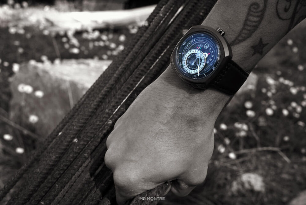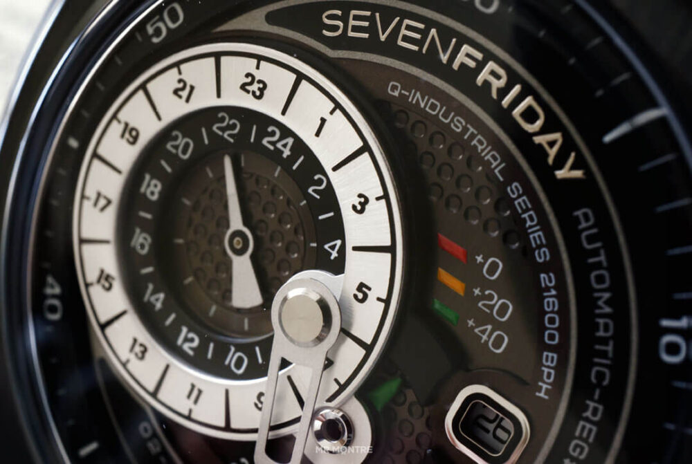 Cette Q3/01 est fidèle à l’ADN et au style casual de Sevenfriday. Pas question de la porter sous un costume, de toute façon avec ses proportions elle ne passera probablement pas sous une manche de chemise. Si le boitier est le même que sur la collection V-Series, ce nouveau cadran lui confère un look racé et sportif. L’animation du disque et des aiguilles est originale même si la lecture n’est pas évidente au premier coup d’œil. Rien d’insurmontable avec un peu d’entrainement.