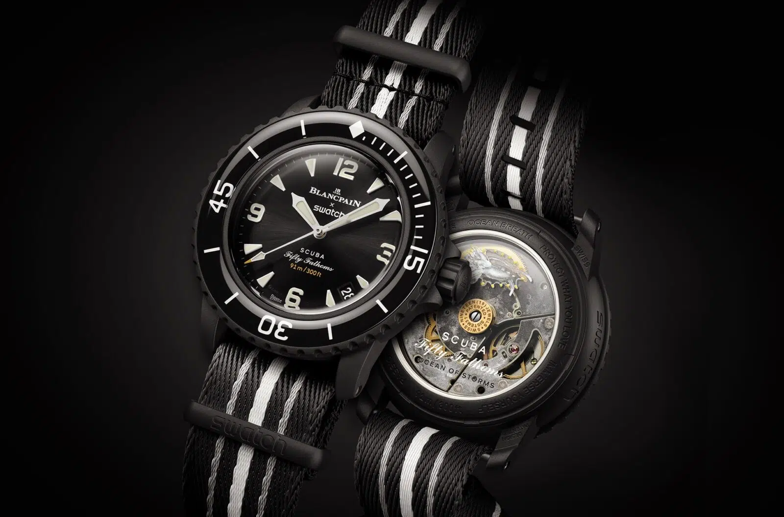 C’est en septembre dernier que le groupe Swatch a levé le voile sur sa nouvelle collection Swatch x Blancpain composée de 5 modèles qui rendent hommage à la Scuba Fifty Fathoms, la première plongeuse moderne. À partir du 11 janvier 2024, et uniquement dans certaines boutiques physiques de la marque (une seule en France), c’est un sixième modèle qui sera disponible à la vente. Baptisé Swatch x Blancpain Ocean of storms, il fait référence à Oceanus Procellarum, mer située à l’ouest de la face visible de la lune.